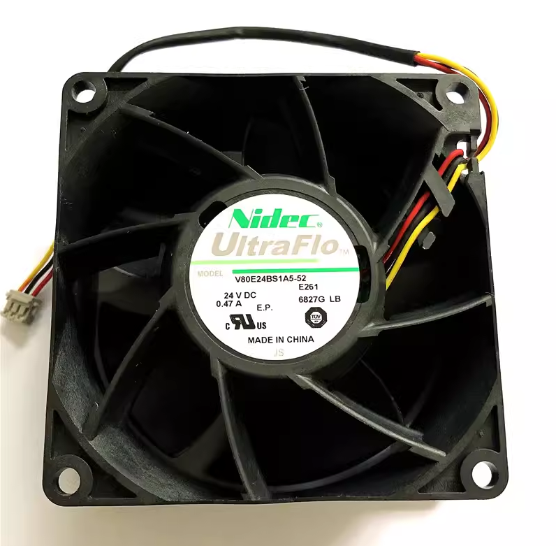 The Nidec V80E24BS1A5-52 is a 24V DC axial cooling fan with an 80x80x38 mm frame size, commonly used in industrial applications like Schneider electric inverters for thermal management. It utilizes a ball bearing structure, contributing to an extended operational lifespan, making it suitable for high-pressure, long-distance air delivery scenarios